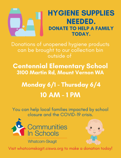 We are hosting a Hygiene Supply Drive at Centennial Elementary School in Mount Vernon from 10a.m.-1p.m. Monday-Thursday June 1-4th, 2020. Please bring unused, unopened items which will be sanitized and distributed to families in need. THANK YOU!